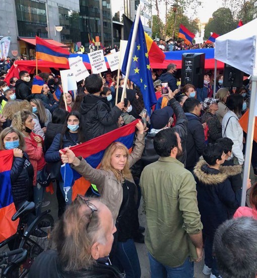 Երեկ Եվրոմիության հրապարակում Բելգիայի հայերի կոմիտեն կազմակերպել էր խաղաղության ցույց, եվրոատյանների ուշադրությանը սևեռելու Արցախում շարունակվող ռազմական գործողությունների եւ միջազգային ատյաններին հորդորելու դատապարտել ոչ միայն Ադրբեջանի ագրեսիան, այլեւ ՆԱՏՕ-ի անդամ Թուրքիայի ակտիվ մասնակցությունն այս պատերազմին: