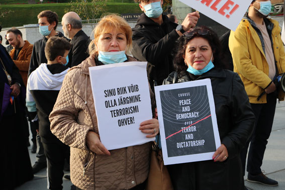 Հոկտեմբերի 12-ին Էստոնիայի մայրաքաղաք Տալլինում տեղի ունեցավ էստոնահայության բողոքի ցույցը՝ ընդդեմ Թուրքիայի եւ Ադրբեջանի սանձազերծած ագրեսիայի։ Ցուցարարները նախ հավաքվել են Տալլինի Սուրբ Գրիգոր Լուսավորիչ եկեղեցում, ապա Հայ Առեքելական եկեղեցու Բալթյան երկրների թեմի առաջնորդ Վարդան Սրբազանի առաջնորդությամբ շարժվել են դեպի Տալլինում Թուրքիայի դեսպանություն։ Ինչպես նշեց ՕՐԵՐ-ի հետ զրույցում Էստոնիայի հայ համայնքի ղեկավար Ռազմիկ Իվանյանը, երթի մասնակիցները կրել են ,,Հայաստանը ցանկանում է խաղաղություն,, , ,,Թուրքիա դադարեցրու ագրեսիան,, , եւ այլ լոզունգներ, ինչպես նաեւ Արցախի անկախությունը ճանաչելու կոչեր։